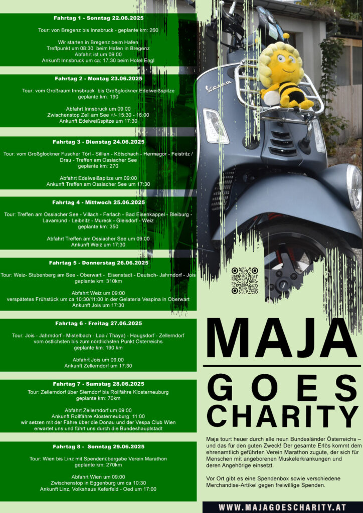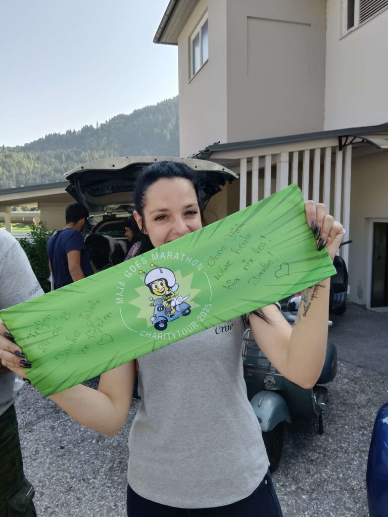 Die gebürtige Luxemburgerin Sandy Häfele (lebt seit 2001 in Österreich) fuhr spendensammelnd mit Maja (ihrer Vespa) durch alle neun österreichischen Bundesländer – von Bregenz bis Linz.